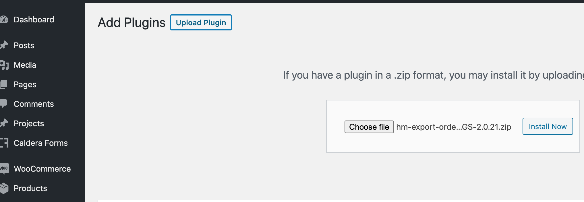 Download the plugin from WP Zone to your computer. Go to Plugins in the WordPress dashboard, and select Add New. Select Upload Plugin at the top left of the screen. Select Choose File and navigate to the downloaded file and select it. Click ** Install Now.**