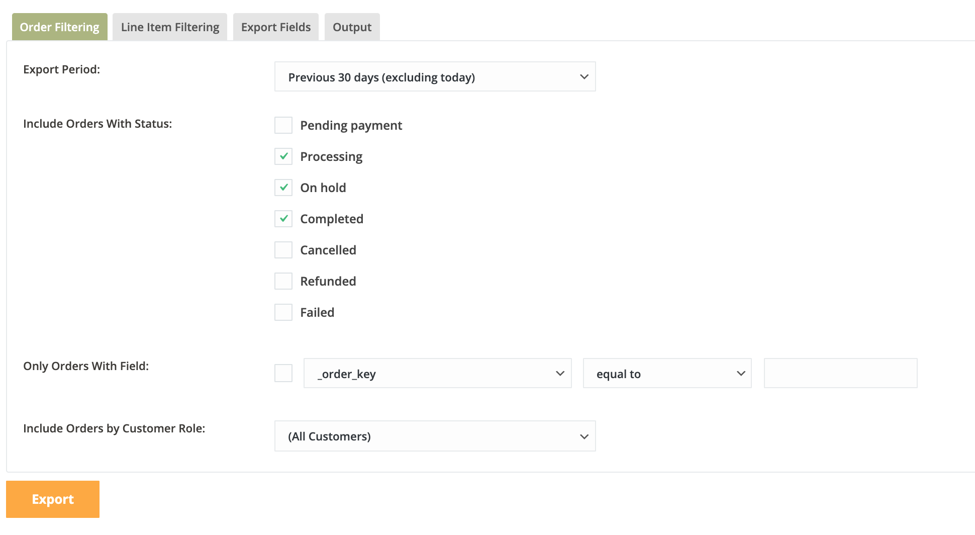 - Include Orders With Status: Limit the export to orders with the selected status(es); for example, you can export only line items from completed orders. By default, only orders with "Processing", "On Hold", or "Completed" status are included. This excludes orders that are "Pending Payment", "Cancelled", "Refunded" or "Failed".