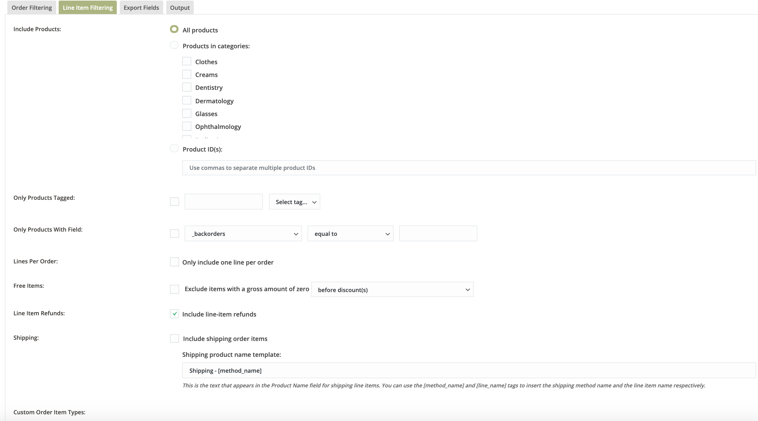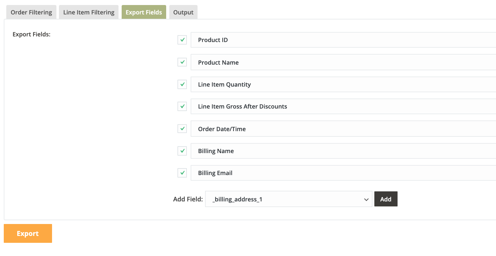 - Shipping: If you enable the "Include shipping order items" option, shipping line items will be included in the export along with product line items. Of the built-in fields, only the following apply to ship items: Product ID (shipping method ID), Product Name (shipping method name), Line Item Gross, Line Item Gross After Discounts, Line Item Tax, Line Item Total With Tax.
