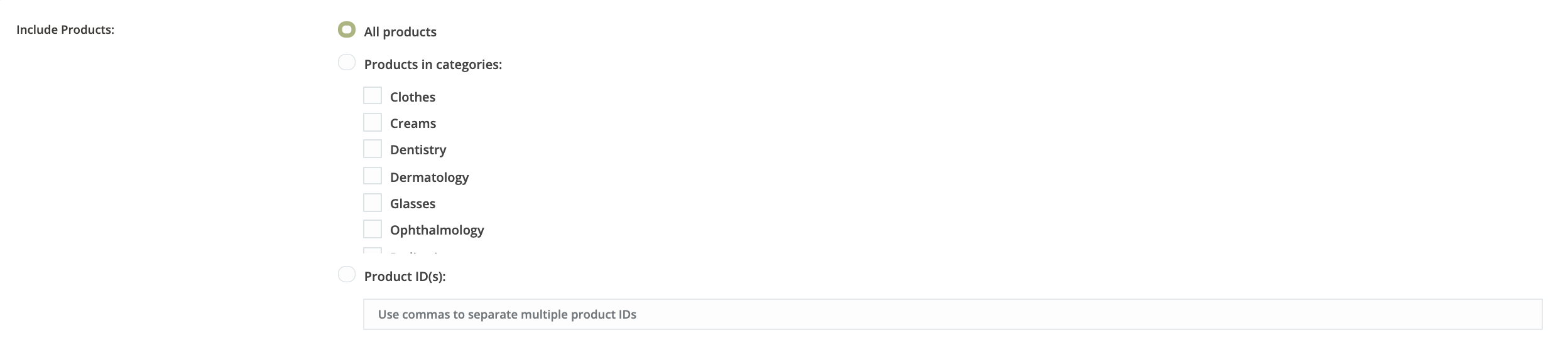 - ** Include Products:** * To export order items for any product in your store*, select "All products". To only export order items for products in one or more categories, select "Products in categories" and check off the categories to include. * To only export order items for one or more individual product(s) *, select "Product ID(s)" and enter the ID number(s) of the product(s), separated with commas. To determine the ID of a product, click "Products" in the left sidebar menu and hover over the product's title; the ID will be displayed below the title.