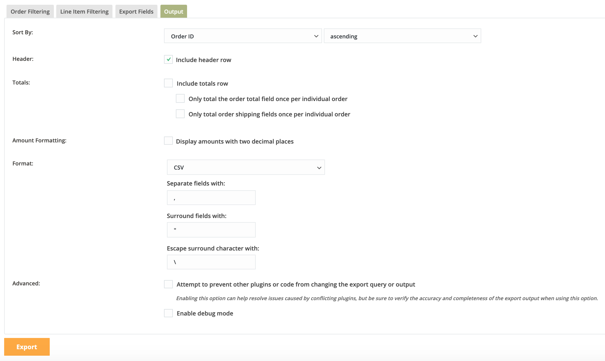 - Advanced: if you prefer to enable debug mode, check "Enable debug mode", preventing from conflicts with other plugins, check first checkbox in this secion. *Click "Export" to generate the data file. Debug mode is only designed to work with HTML format. It may work with other formats like CSV, but it will definitely corrupt XSLX files.