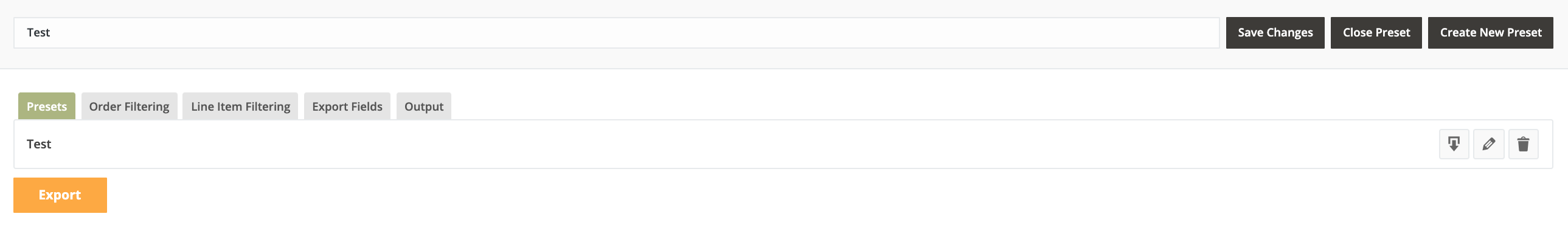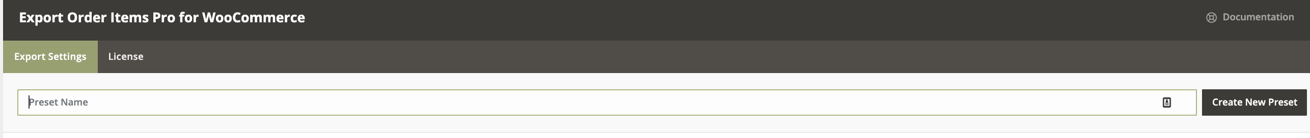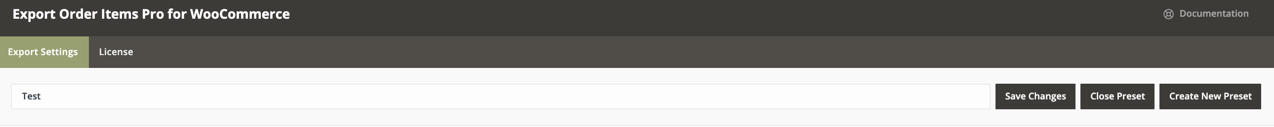 Once you have set up an Export Order Items Pro report you can save your report settings as a preset: simply enter a name for the preset in the field above the report settings tabs and click the " Create New Preset" button. The preset will then appear in the Presets tab.